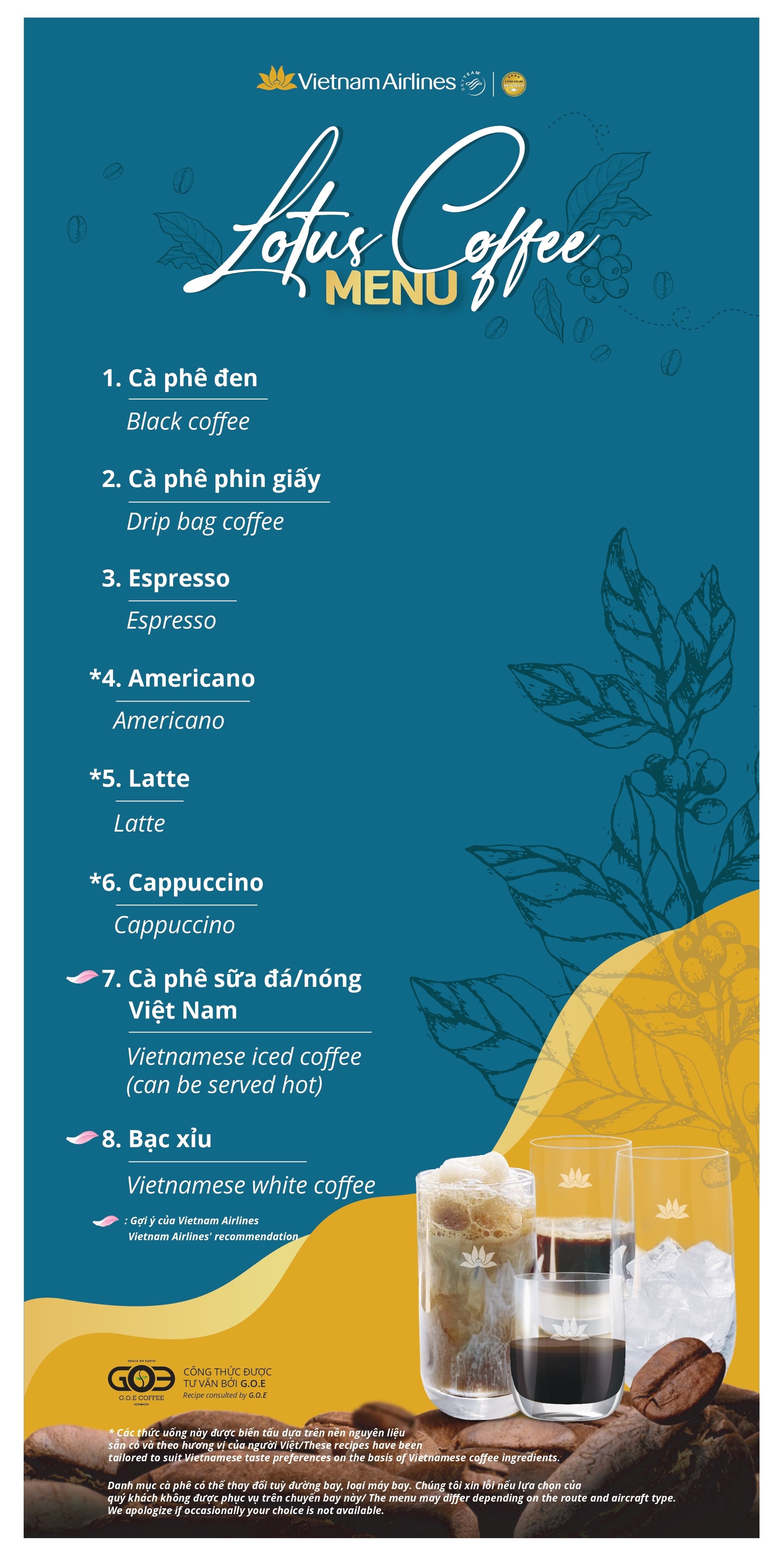 • Thực đơn đồ uống có thể thay đổi tùy thuộc vào thời gian, mùa vụ, loại máy bay, đường bay và một số điều kiện khách quan khác;